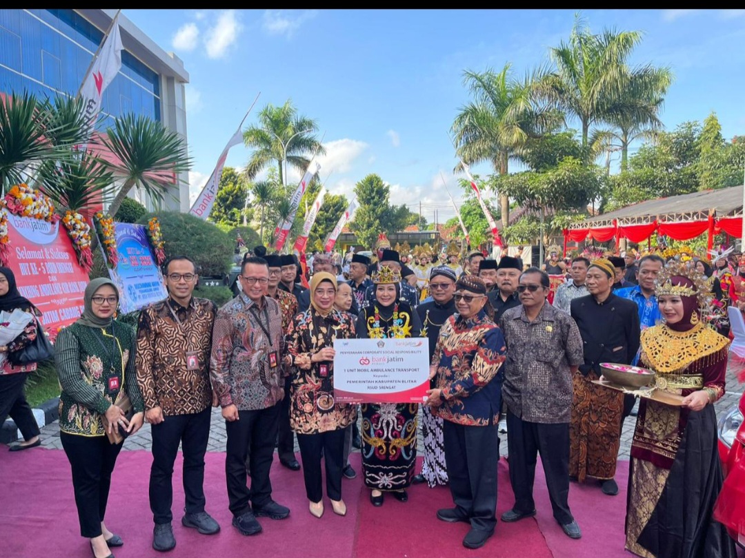 BLITAR,Krjatim.com – 12 September 2025. – PT Bank Pembangunan Daerah Jawa Timur Tbk (Bank Jatim) secara resmi telah menyerahkan bantuan Corporate Social Responsibility (CSR) kepada RSUD Srengat berupa satu unit ambulan pada hari Jumat (12/9). Penyerahan CSR dilakukan secara simbolis oleh Pimpinan Bank Jatim Cabang Blitar Five Seodisa Adha dengan didampingi oleh AVP Komunikasi Korporat Mi’roj Subhanto kepada Bupati Blitar Rijanto dalam acara peringatan hari ulang tahun ke-5 RSUD Srengat.