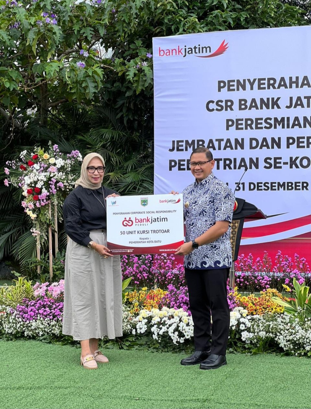 BATU,KORANRAKYATJATIM.COM – 31 Desember 2024. Sebagai bentuk tanggung jawab sosial perusahaan kepada lingkungan sekitar, PT Bank Pembangunan Daerah Jawa Timur Tbk (bankjatim) secara resmi telah menyerahkan bantuan Corporate Social Responsibility (CSR) kepada Pemerintah Kota Batu. Bantuan yang diberikan berupa 50 buah kursi trotoar dan 1 unit toilet portable caravan. Bertempat di Pendopo Kota Batu, CSR tersebut diserahkan secara simbolis oleh Pjs. Pemimpin Bank Jatim Cabang Batu Sugiastuti kepada Pj. Walikota Batu Aries Agung Paewai pada hari Selasa (31/12).