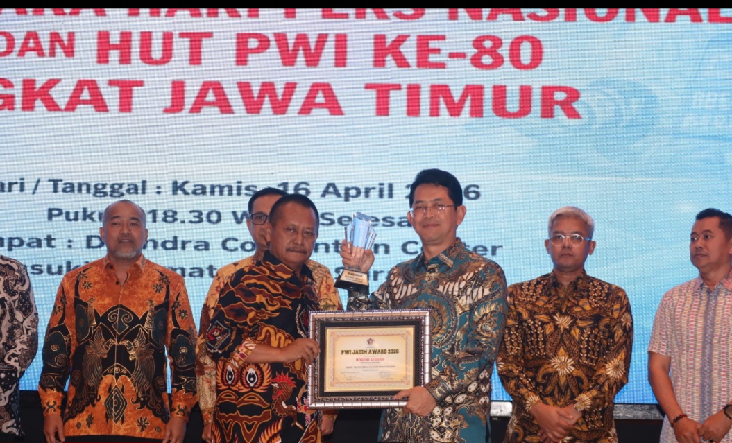 SURABAYA, Krjatim.com – 16 April 2026. Direktur Utama Bank Jatim Winardi Legowo sukses meraih penghargaan bergengsi sebagai Tokoh Transformasi Perbankan Daerah dari Persatuan Wartawan Indonesia (PWI) Jawa Timur. Penghargaan tersebut diberikan sebagai bentuk apresiasi atas kontribusi dan kepemimpinan beliau dalam mendorong inovasi serta transformasi di sektor perbankan daerah. Bertempat di Dyandra Convention Center Surabaya, penghargaan diserahkan langsung oleh Ketua PWI Jawa Timur Lutfil Hakim dan diterima oleh Winardi Legowo dalam kegiatan puncak resepsi Peringatan Hari Pers Nasional (HPN) 2026 sekaligus HUT ke-80 PWI pada hari Kamis malam (16/4). Turut hadir dalam kesempatan tersebut Menteri Haji dan Umrah Republik Indonesia Mochamad Irfan Yusuf, Wakil Gubernur Jawa Timur Emil Elestianto Dardak, serta Ketua PWI Pusat Akhmad Munir.